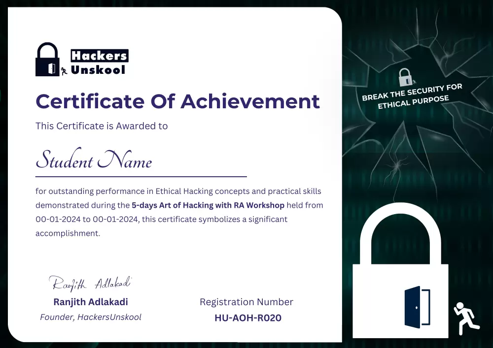 Complete our 5-Part Masterclass, pass a simple challenge, and earn your HackersUnskool Certificate!